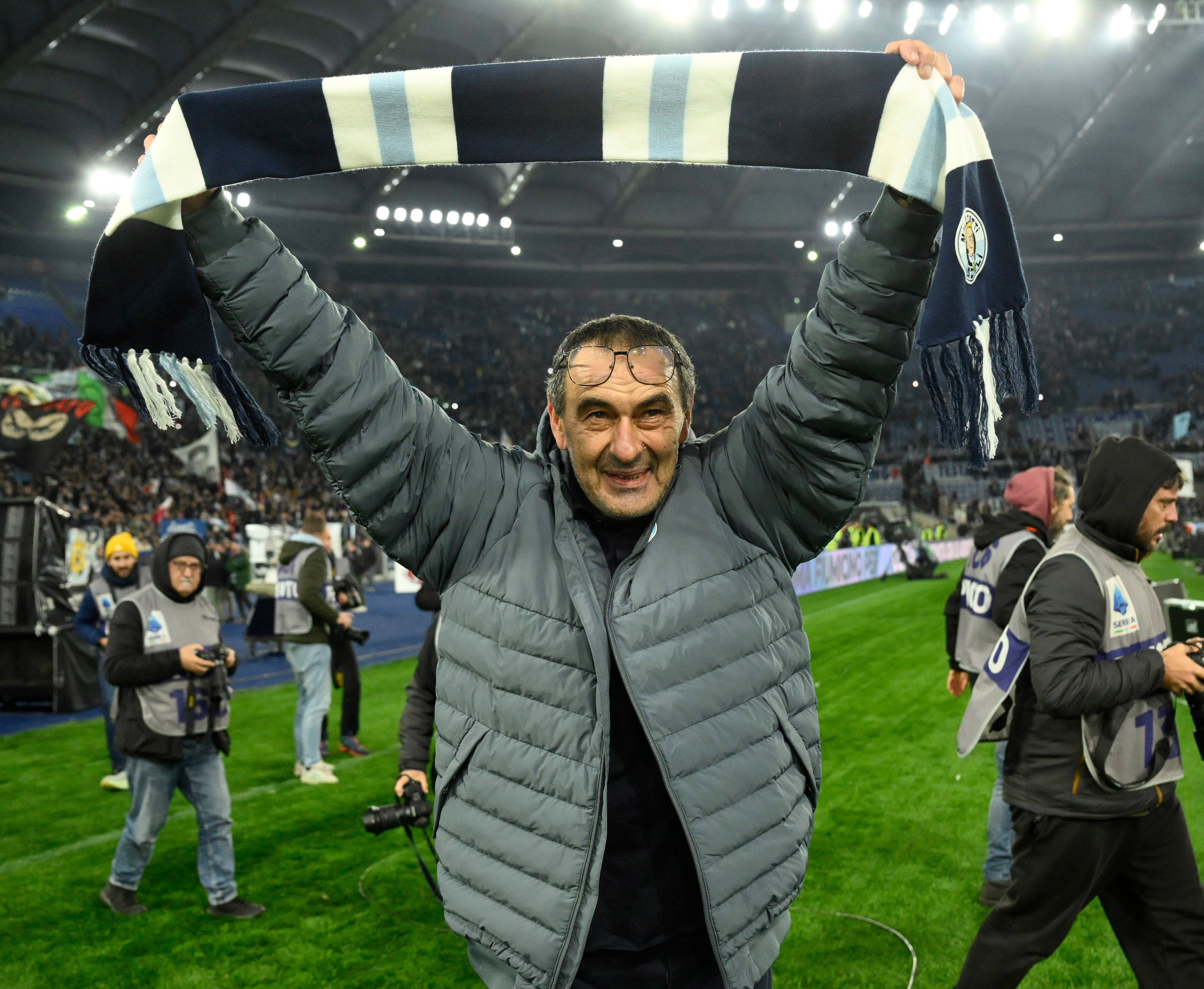 3月15日,拉齐奥队主教练萨里在赛后庆祝获胜。 新华社发(阿尔贝托·林格利亚摄)